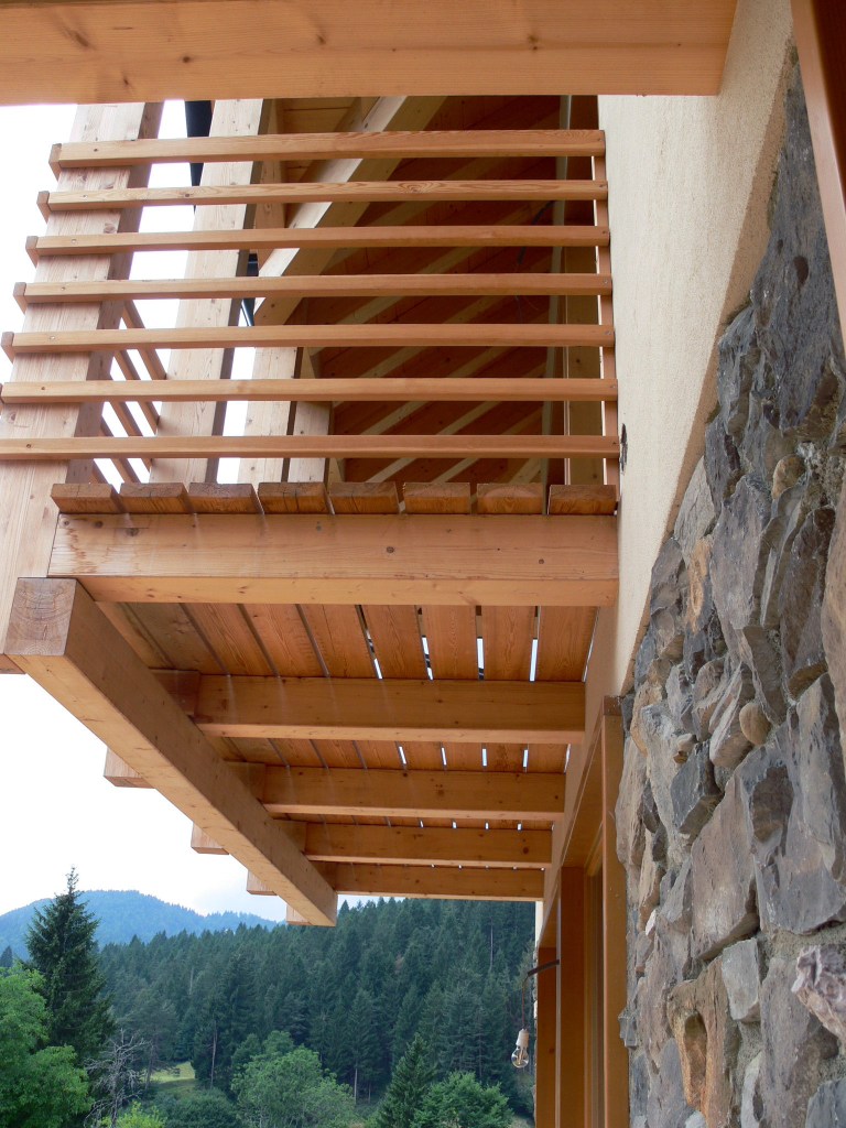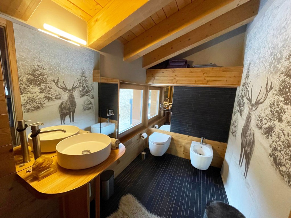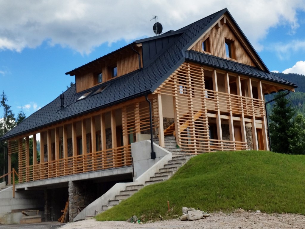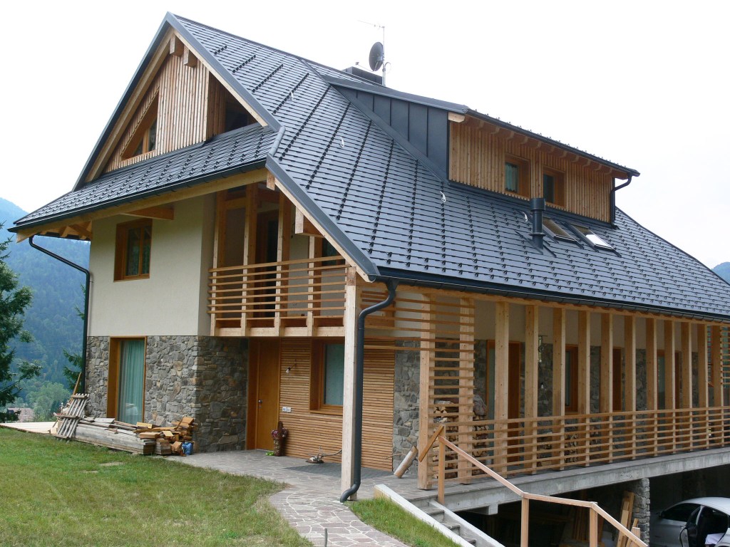 La struttura combina materiali tradizionali e innovativi: la scatola in calcestruzzo armato si estende dalle fondazioni fino al primo solaio, mentre l’elevazione superiore è realizzata in legno lamellare X-Lam, con ballatoi e pendinature in legno, elementi tipici della tradizione locale. I rivestimenti esterni alternano pietra e doghe di larice, mentre la copertura è realizzata con scandole in alluminio color grigio antracite, unendo estetica e durabilità.