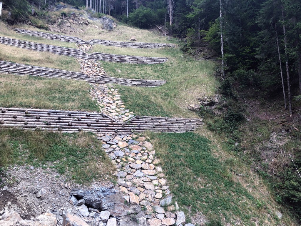 È stato inoltre realizzato un arginello in pietrame, utilizzando il materiale proveniente dalla riprofilatura dei versanti, con la funzione di contenimento di eventuali future colate detritiche. A completamento dell’intervento sono state eseguite opere di difesa spondale, mediante scogliere parzialmente cementate, e la rinaturalizzazione dell’alveo, ripristinato secondo l’aspetto naturale del rio.