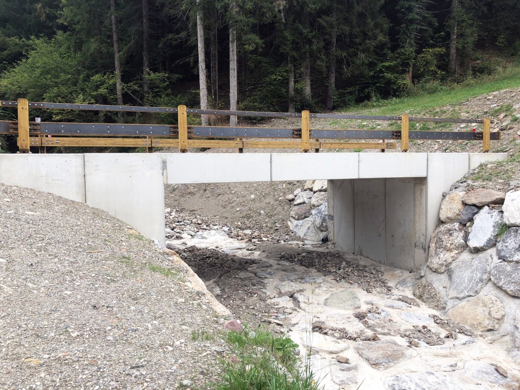 Il primo intervento ha riguardato il ripristino del passaggio carraio in attraversamento del Rio Gladegna. Il nuovo manufatto è costituito da una canna armata in calcestruzzo armato con luce di 4,00 m, idonea al transito del piano stradale, ed è completato da una sicurvia realizzata in legno lamellare e acciaio corten, scelta che coniuga resistenza strutturale e integrazione paesaggistica.