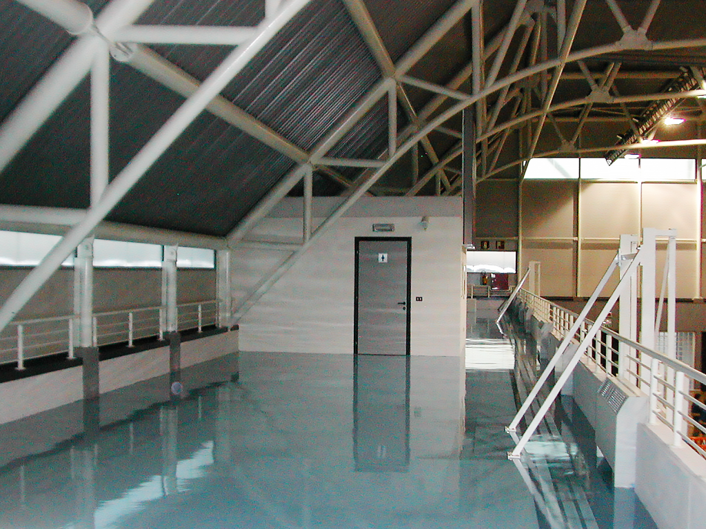 Gli spazi per l’attività sportiva comprendono un campo da gioco trivalente per calcetto, pallacanestro e pallavolo, mentre grazie a tribune telescopiche chiuse e a una partizione mobile a scendere, è possibile delimitare due campi di basket minori, adatti per campionati giovanili. Gli spogliatoi, il pronto soccorso, la palestra per muscolazione e i depositi attrezzatura completano le aree di servizio, garantendo funzionalità e comfort agli atleti.
