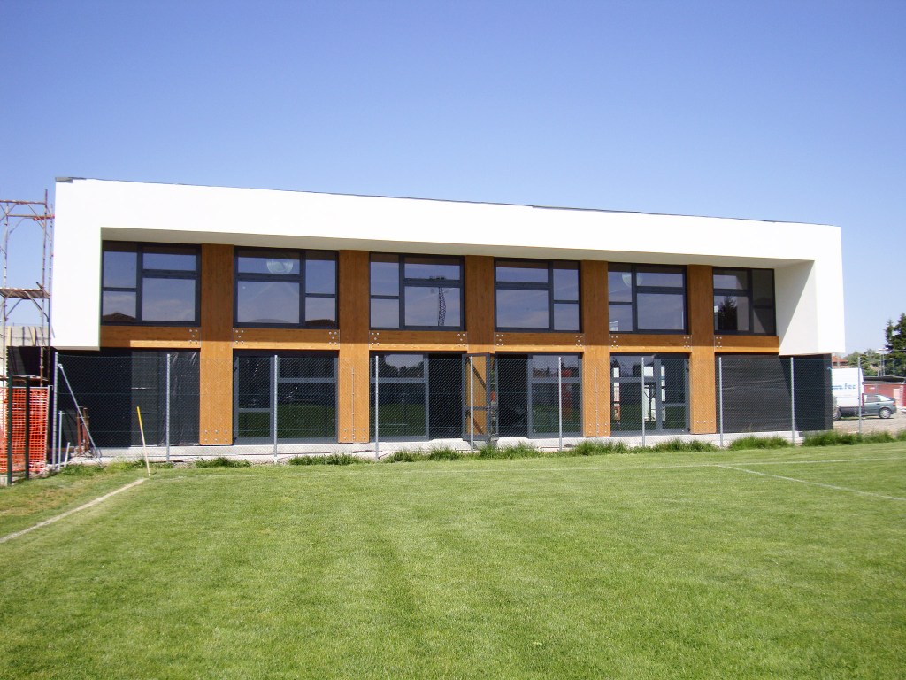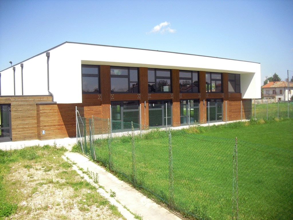 In previsione di possibili futuri sviluppi dell’area, attualmente destinata a campo di calcio, il versante est dell’edificio è caratterizzato da una pensilina-porticato, che conferisce all’intervento una connotazione più urbana e armonica con il contesto circostante. Il fabbricato, a pianta rettangolare, combina strutture portanti verticali in cemento armato e strutture orizzontali in travi di legno lamellare, unendo solidità e leggerezza strutturale.