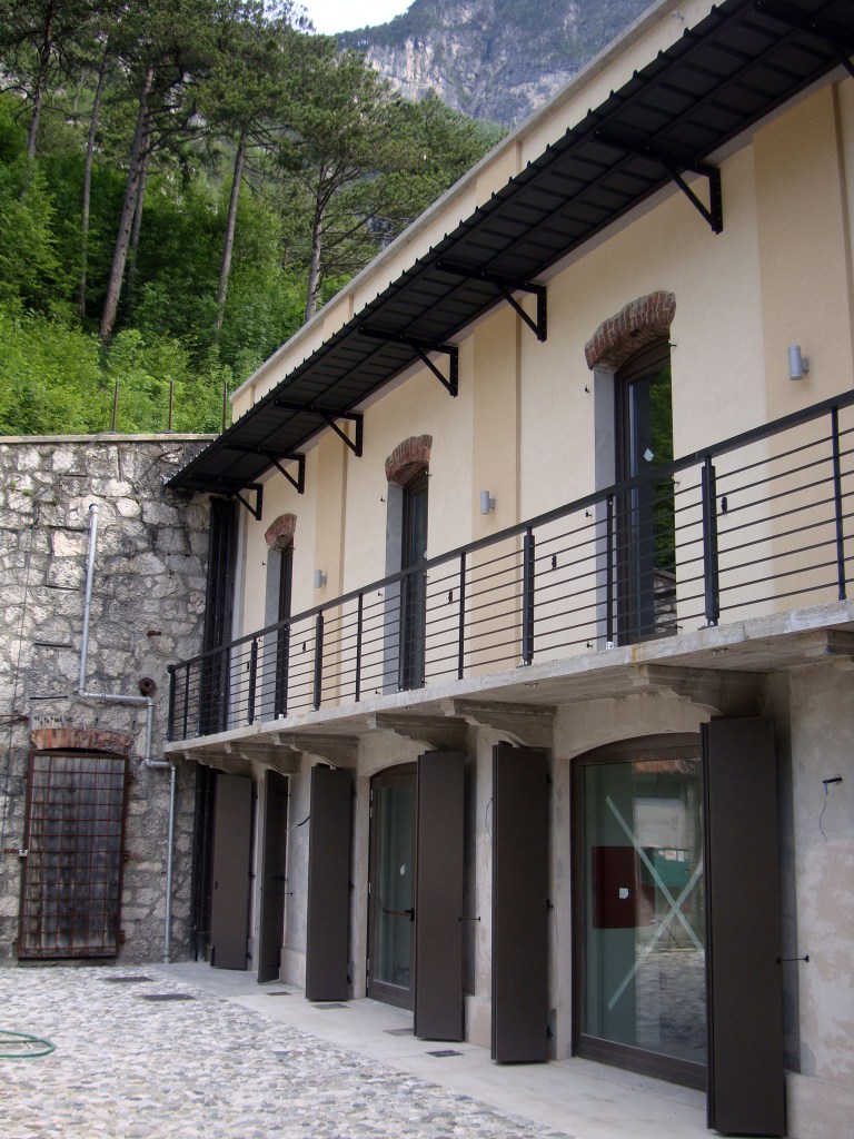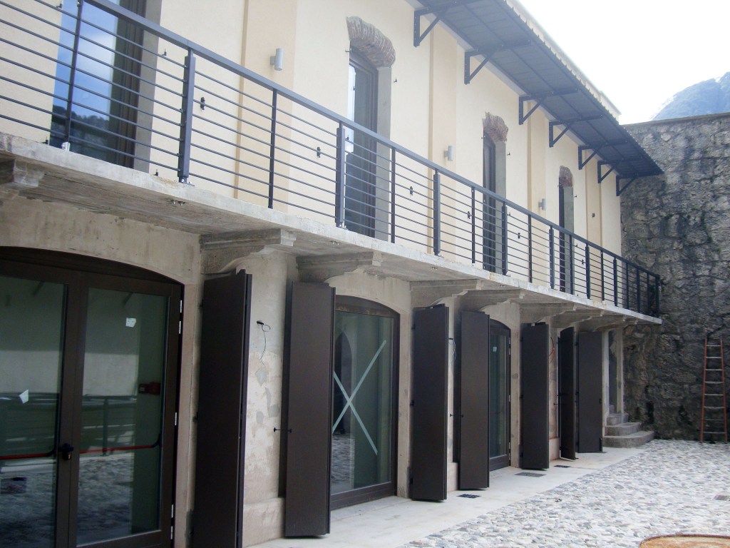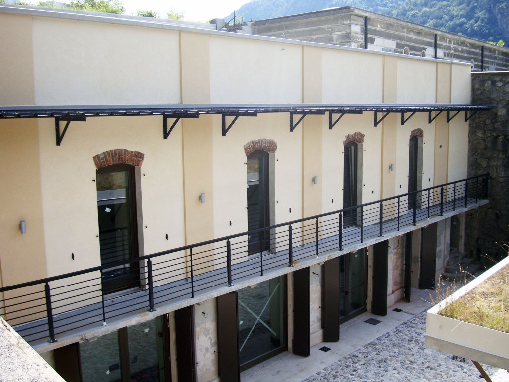 Gli interventi progettuali si suddividono in tre categorie principali: conservativi e di manutenzione, recupero e ristrutturazione e completamento. Gli interventi conservativi hanno riguardato la messa in sicurezza statica, il risanamento delle murature di contenimento, l’eliminazione delle infiltrazioni in copertura e la sistemazione degli spazi esterni. La ristrutturazione ha incluso la riconversione dell’alloggio ufficiali, con consolidamenti strutturali, risanamenti, realizzazione di nuovi impalcati, opere di isolamento, rivestimenti e finiture, oltre all’installazione di impianti tecnologici. Completano l’intervento gli spazi per la preparazione dei pasti nell’ex alloggio truppe, comprensivi di nuovi impianti, sostituzione dei serramenti e modifiche interne per garantire funzionalità e comfort.