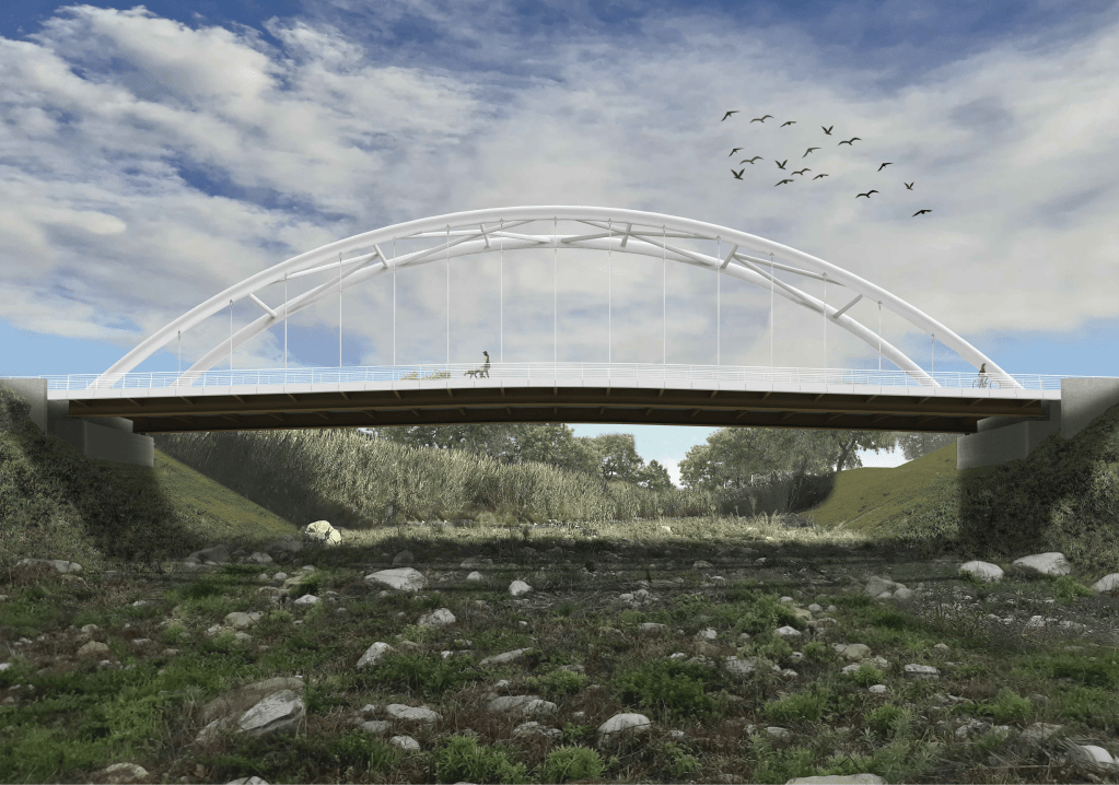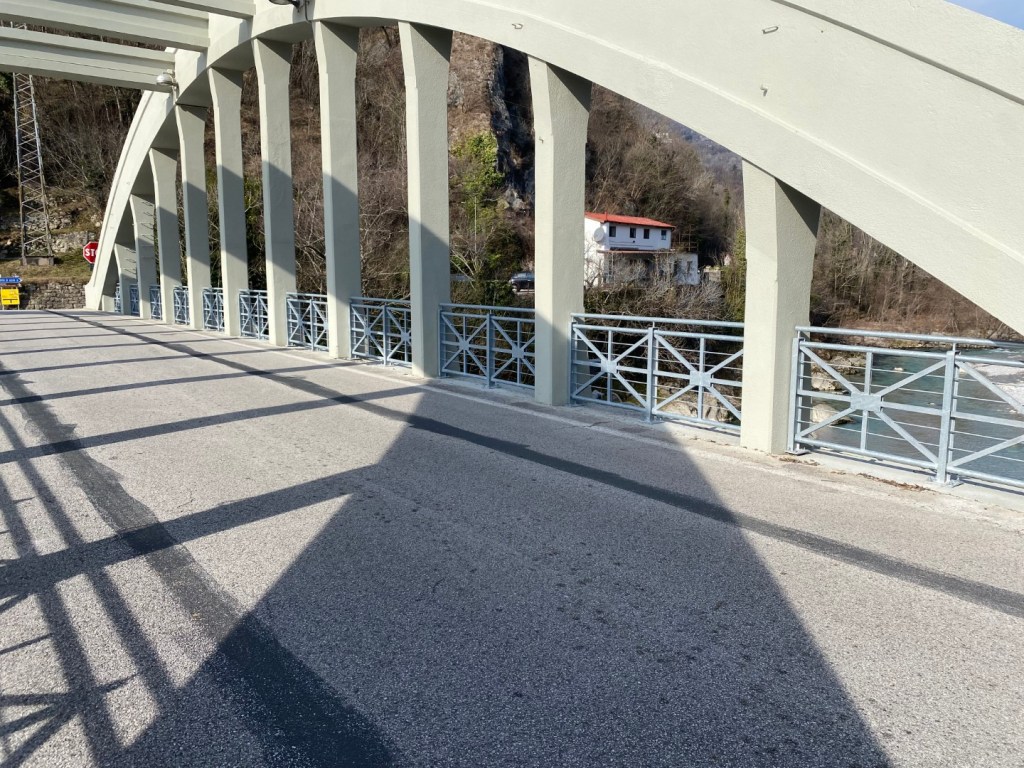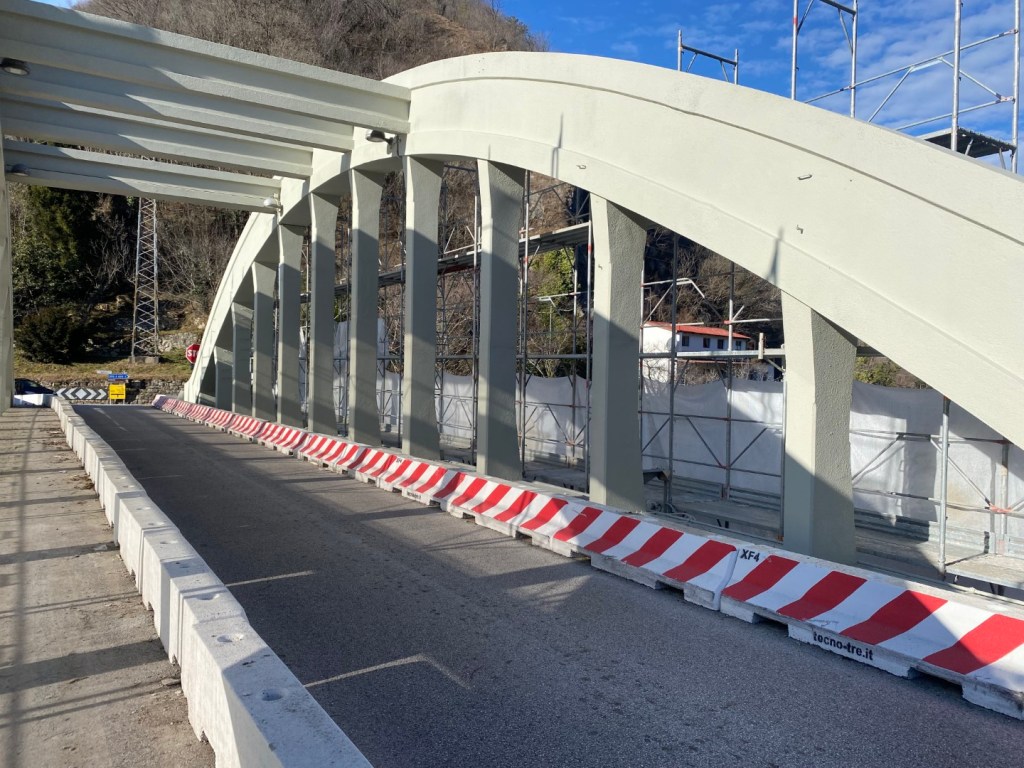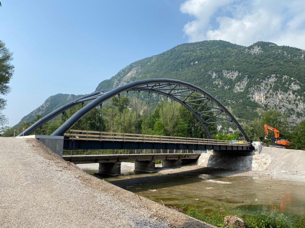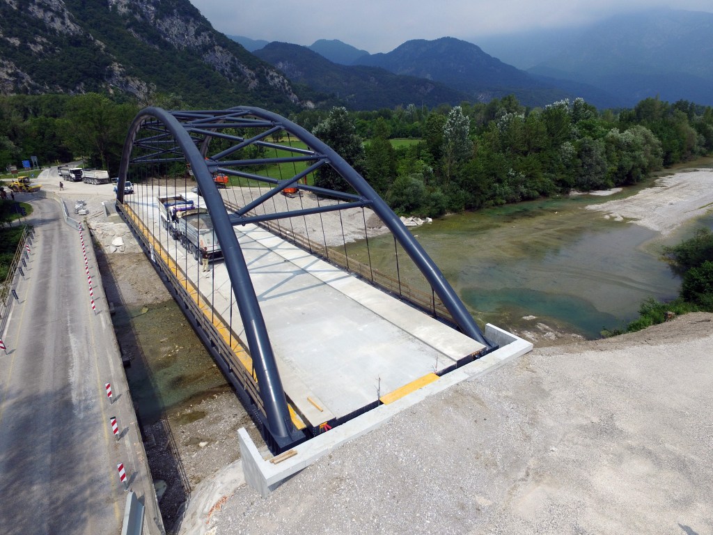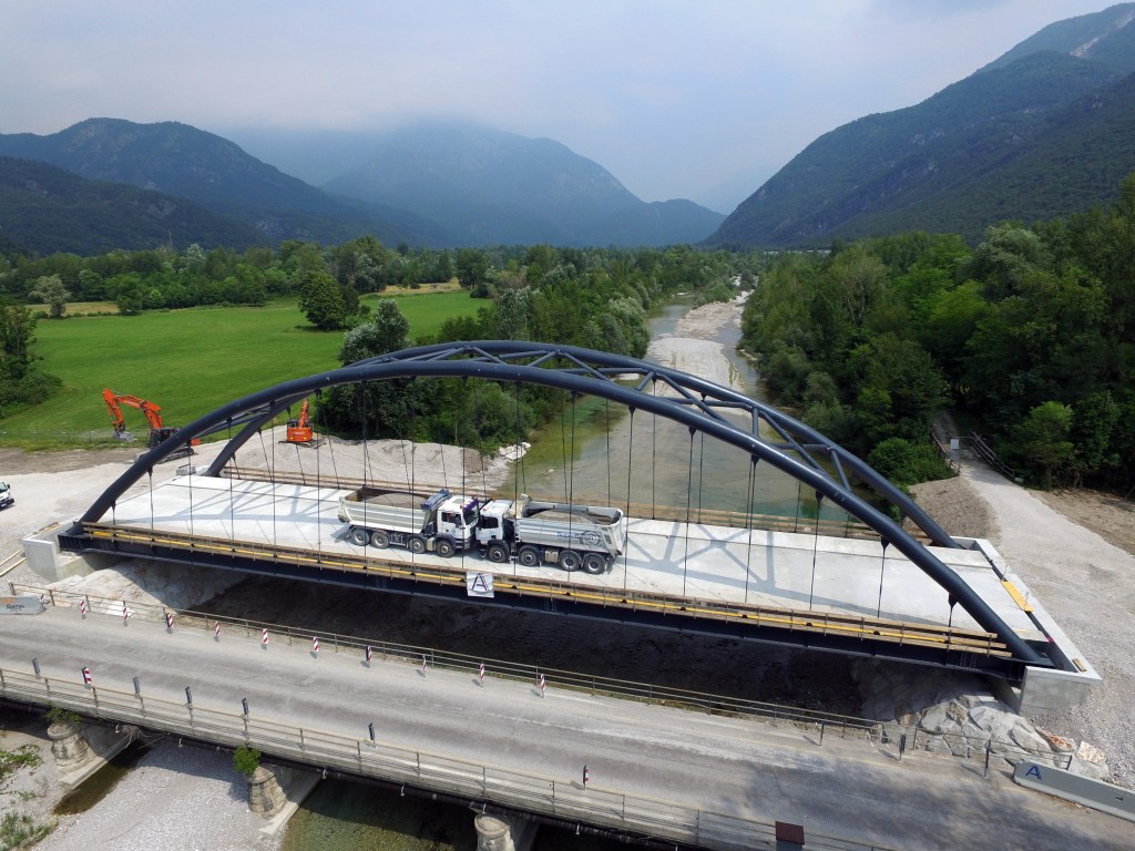 Il nuovo ponte è stato realizzato poco più a monte della struttura esistente ed è costituito da un ponte in acciaio ad arco a via inferiore a spinta eliminata, una soluzione che coniuga efficienza strutturale e qualità architettonica.