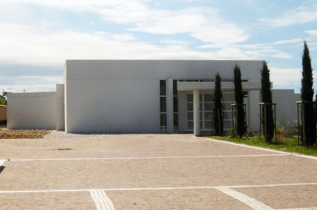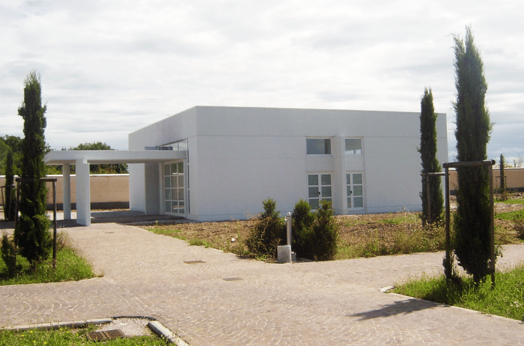 La sala del commiato, a pianta quadrata, costituisce il corpo principale ed è realizzata come una scatola muraria in cemento armato con copertura cassettonata in legno lamellare. Le ampie finestrature garantiscono luminosità naturale e un ambiente raccolto ma accogliente. La sala di preparazione, interconnessa alla sala principale, è anch’essa realizzata con strutture in cemento armato e solai prefabbricati in cemento, offrendo funzionalità e efficienza operativa. L’accesso al complesso avviene tramite un porticato in cemento facciavista, elegantemente pavimentato in porfido, che conferisce un ingresso solenne e rispettoso del contesto.